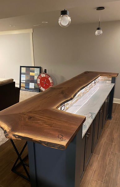 This custom entertaining space required a complete gut of the area, with the installation of new cabinetry, appliances, counter top and backslash, and a custom live-edge island counter and a unique illuminated floating shelve design to serve as the clients liquor display.